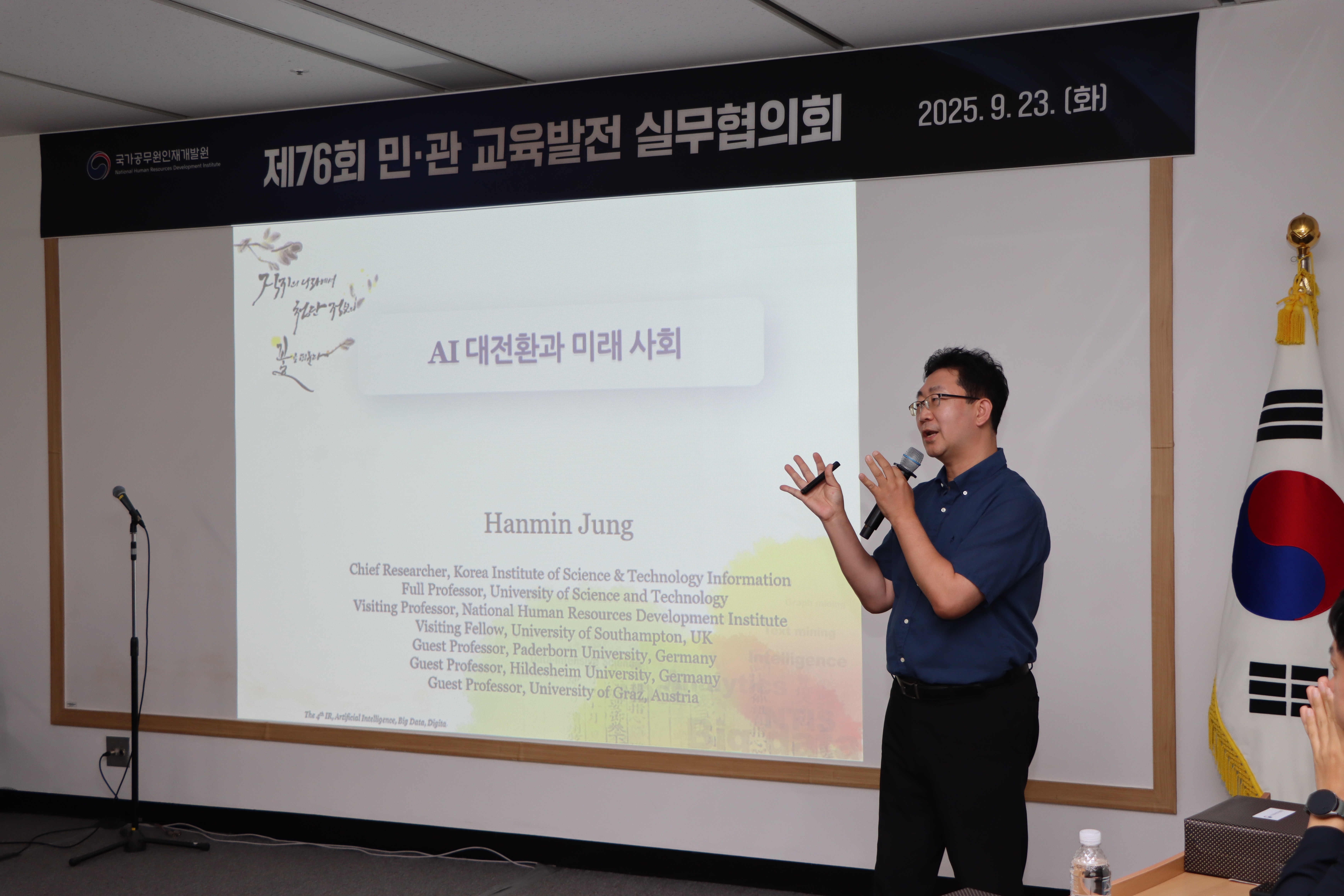 ▲ 지난 23일 국가인재원 진천본원에서 개최된 '제76회 민·관 교육발전 실무 협의회'에서 한국과학기술정보연구원 정한민 교수가 'AI 대전환과 미래사회'를 주제로 강연을 하고 있다.